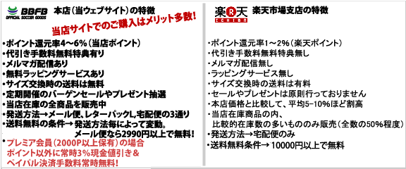A1. 当店で扱っている商品は、全てメーカーオフィシャル品となります。 商品の仕入れ時には、検品を徹底し、不良商品の混入を防ぎ、 商品管理と品質維持に努めております。 また当店では、自社サイト以外に、楽天市場でも販売を行っております。 バルボラフットボール楽天市場支店(別枠表示)* 楽天市場への出店に際して、ナイキ、アディダス、アンブロ等のメーカー 商品を扱う場合には、各メーカー工場から当店まで、商品の仕入れルートを 証明する必要がございます。 例えば、ナイキ工場⇒仲介業者A⇒当店という流れあった場合、 ナイキから仲介業者Aまで、仲介業者から当店までの正式な出荷伝票 や明細書を用意し、楽天市場に提出・審査されることで、 初めて楽天市場でのナイキ商品の販売許可がおります。 ですので、楽天市場への出店が許可されるという事は、楽天市場という 第三者の機関から、当店の商品が正しくメーカー工場から出荷された証明 でもありますので、よろしければ、当店商品の品質保証の一つとして、 ご参考にしていただければと思います。 なお、当サイトと楽天市場支店での商品価格やサービスにいくつか違いがございます。 以下比較表となります。